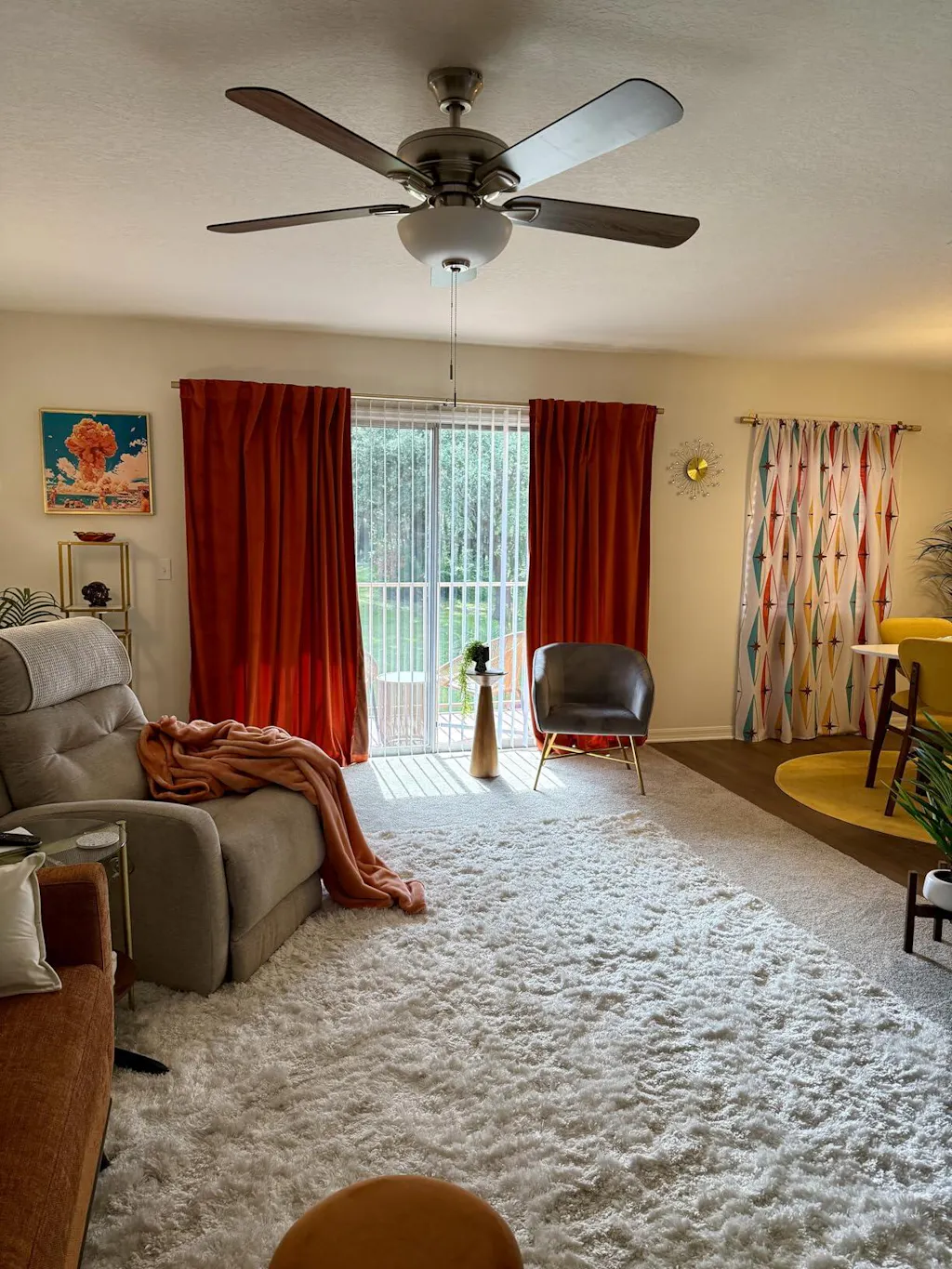 —Color variations due to added lining (compare lined curtains to unlined curtains).
